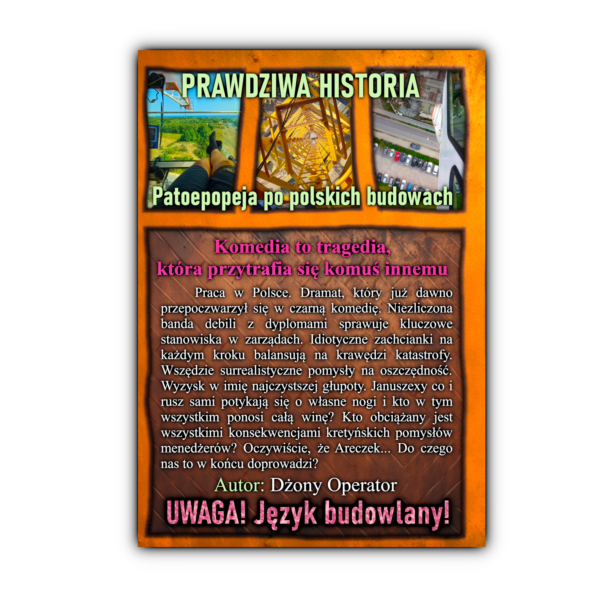 Ta epopeja po budowach ma 607 stron prawdziwych historii, których każdy z nas niejednokrotnie doświadczył. Zapraszam na wędrówkę po istnych Himalajach patologii. Z samego serca placu budowy. Na komedię, która wywołuje salwy śmiechu do momentu, kiedy uzmysłowimy sobie, że wszystkie te odklejone akcje miały miejsce naprawdę. I spotykają nas wszystkich. Każdego dnia. Tuż za naszymi oknami i w naszych własnych miejscach pracy.